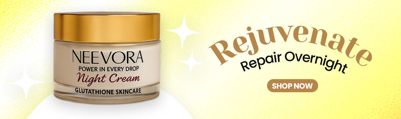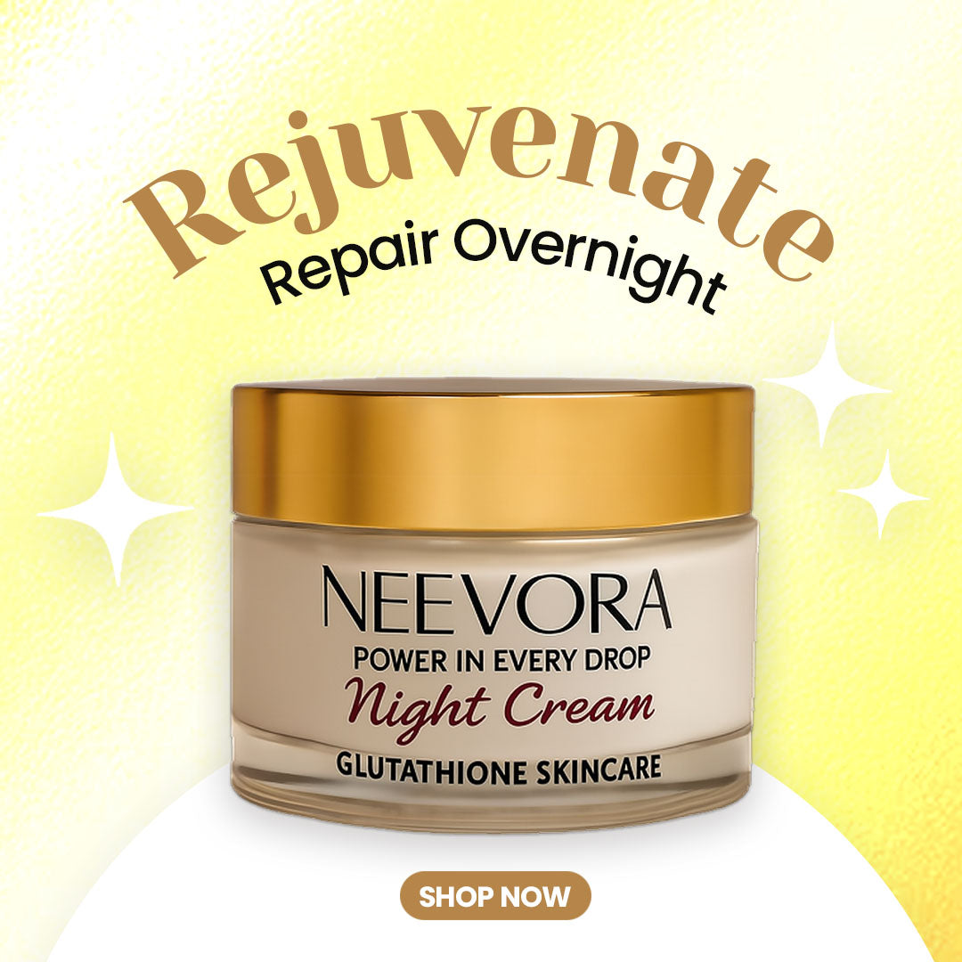 indulge your skin overnight with Neevora Night Cream — a premium formula enriched with glutathione to promote advanced skin rejuvenation. This rich, velvety cream deeply hydrates and repairs your complexion as you sleep,