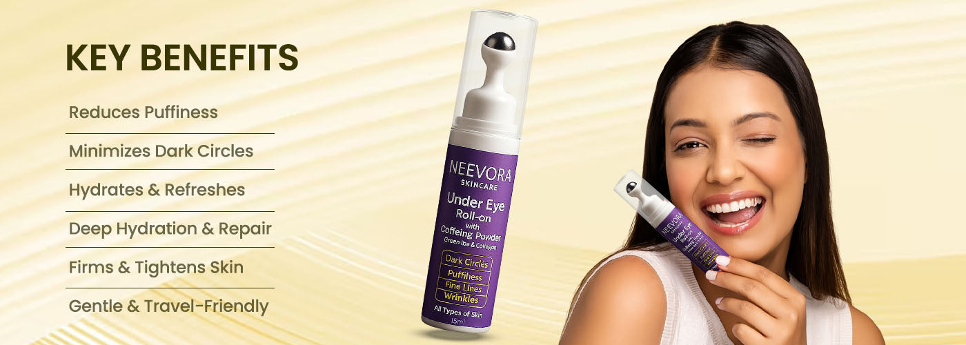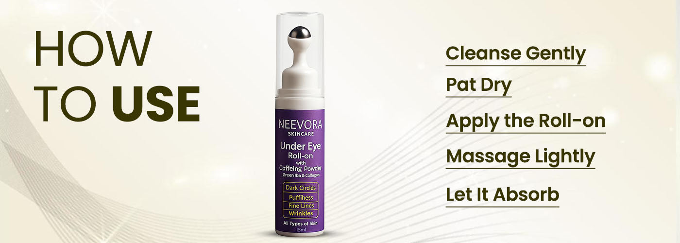 Glide the Neevora Under Eye Roll-on gently under each eye, focusing on dark circles.